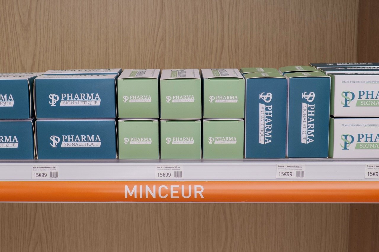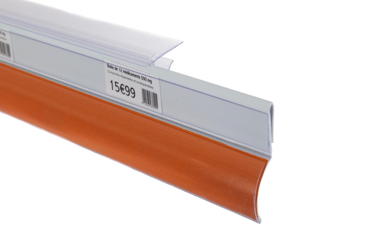 Réglette « Auto Médication Familiale » double affichage pour étagère verre, plate + galbée, version inclinée